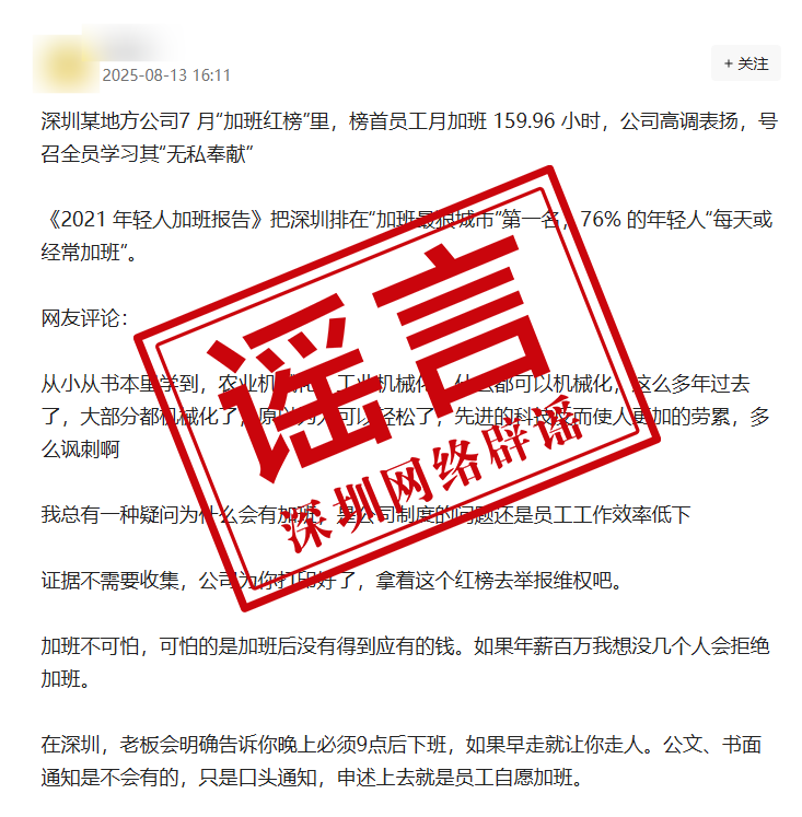 近日,一則《關(guān)于加班的通報(bào)表揚(yáng)》在社交平臺(tái)引發(fā)熱議。部分網(wǎng)帖將涉事企業(yè)與深圳強(qiáng)行關(guān)聯(lián),冠以“深圳某公司”名義進(jìn)行傳播,并稱深圳存在普遍的加班現(xiàn)象。經(jīng)核實(shí),涉事企業(yè)非深圳企業(yè)。