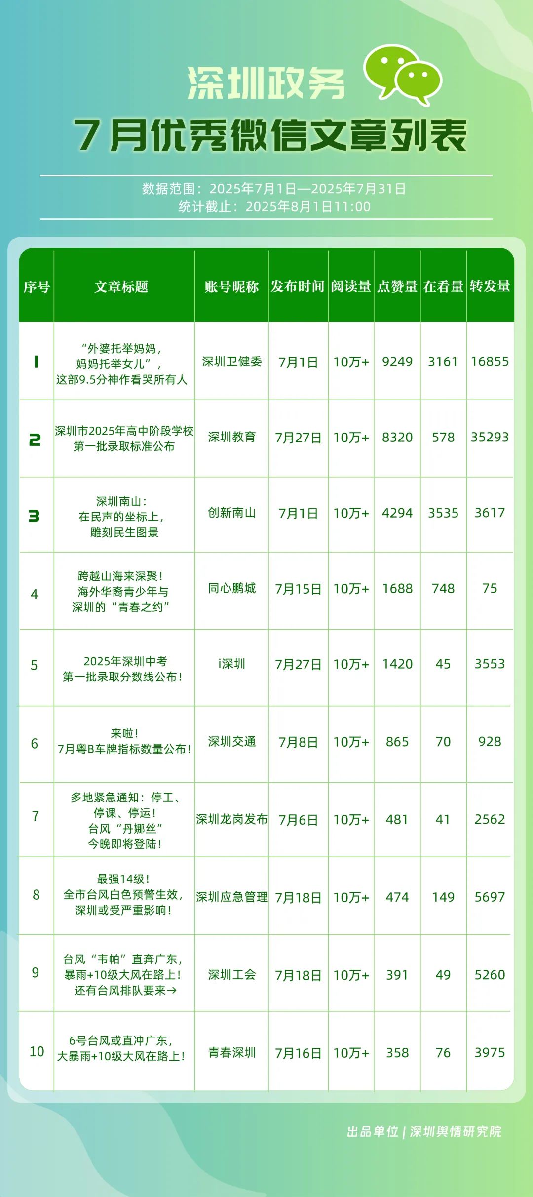 7月,30個政務(wù)微信公眾號入選“深圳優(yōu)秀政務(wù)微信公眾號”榜單,其中包括“深圳衛(wèi)健委”“深圳龍崗發(fā)布”“幸福福田”“創(chuàng)新南山”“i深圳”“深圳教育”“青春深圳”“深圳工會”“深圳光明”“濱海寶安”等。7月,“深圳衛(wèi)健委”內(nèi)容專業(yè)性與傳播力優(yōu)勢穩(wěn)固,整體表現(xiàn)保持較高水平,位于榜首;“深圳龍崗發(fā)布”聚焦民生服務(wù)與區(qū)域活動宣傳,實(shí)現(xiàn)傳播效果提升,位居第二;“幸福福田”表現(xiàn)同樣不俗,排名第三。“創(chuàng)新南山”“深圳教育”“深圳工會”等也積極發(fā)布高質(zhì)量信息與服務(wù)內(nèi)容,能夠較好平衡內(nèi)容“質(zhì)”與“量”,排名有所提升。上榜微信公眾號依托特色優(yōu)勢深耕內(nèi)容創(chuàng)作,將優(yōu)質(zhì)內(nèi)容作為核心支撐,成為政務(wù)傳播領(lǐng)域的優(yōu)秀典范。