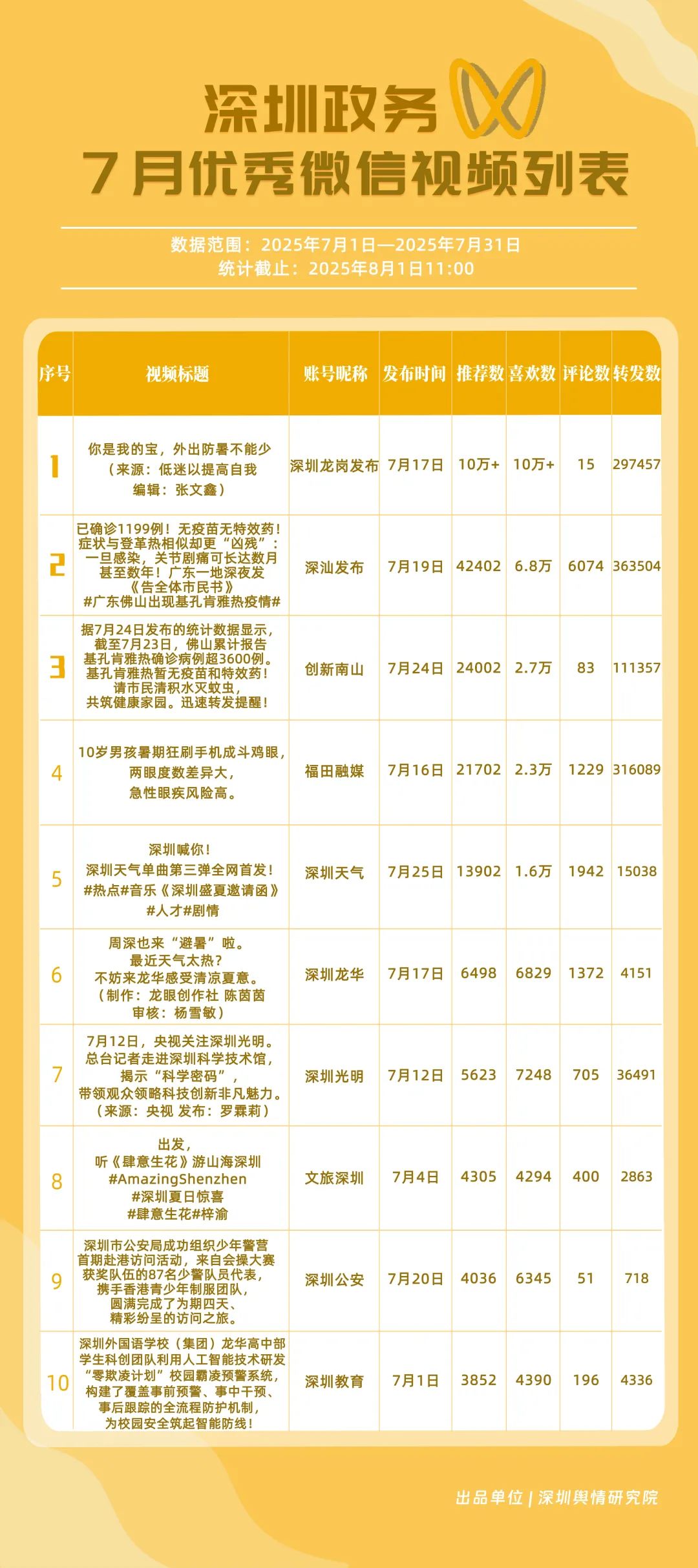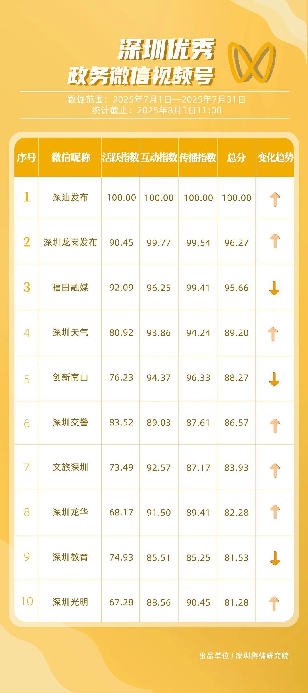 7月,獲得“深圳優(yōu)秀政務(wù)微信視頻號”稱號的是“深汕發(fā)布”“深圳龍崗發(fā)布”“福田融媒”“深圳天氣”“創(chuàng)新南山”“深圳交警”“文旅深圳”“深圳龍華”“深圳教育”“深圳光明”。其中,“深汕發(fā)布”持續(xù)輸出熱點(diǎn)內(nèi)容,收獲大量網(wǎng)民關(guān)注、互動,三項(xiàng)指標(biāo)均達(dá)滿分,位居榜首;“深圳龍崗發(fā)布”“福田融媒”緊隨其后,總分均超過95分,兩賬號通過多樣化的內(nèi)容呈現(xiàn),在活躍、互動及傳播等方面均有出色表現(xiàn);“深圳天氣”“創(chuàng)新南山”“深圳交警”等賬號也獲得不錯成績,總分均在85分以上。上榜微信視頻號精準(zhǔn)把握平臺特性,高效傳遞了政務(wù)信息,更成為展現(xiàn)城市活力、拉近政府與民眾距離的重要窗口。