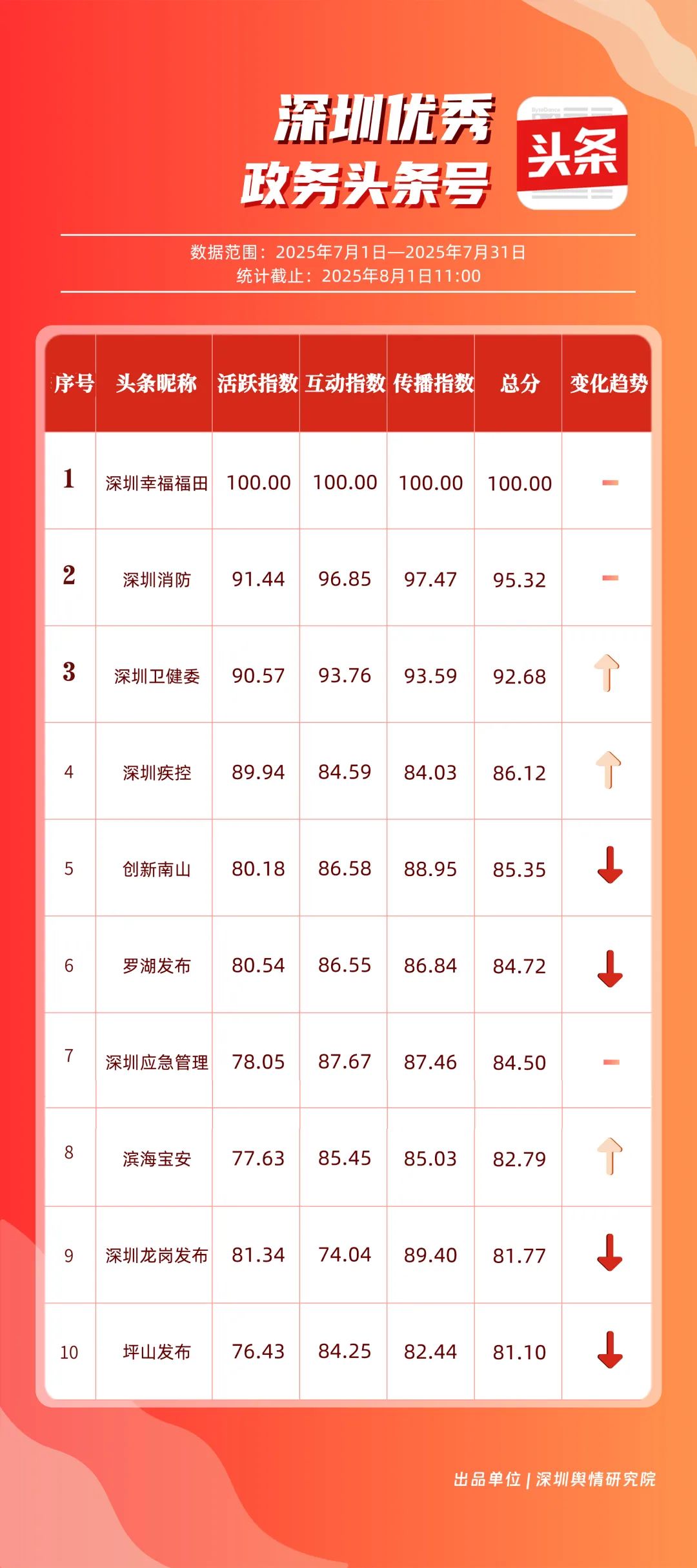 7月,“深圳幸福福田”“深圳消防”“深圳衛(wèi)健委”“深圳疾控”“創(chuàng)新南山”“羅湖發(fā)布”“深圳應(yīng)急管理”“濱海寶安”“深圳龍崗發(fā)布”“坪山發(fā)布”共10個政務(wù)頭條號入選“優(yōu)秀政務(wù)頭條號”榜單?!吧钲谛腋8L铩薄吧钲谙馈睉{借優(yōu)質(zhì)內(nèi)容持續(xù)吸引用戶關(guān)注,穩(wěn)居前二;“深圳衛(wèi)健委”表現(xiàn)亮眼,評分達(dá)92.68分,排名較6月有所上升;“深圳疾控”同樣進(jìn)步明顯,在疾病預(yù)防控制信息傳播上發(fā)揮了重要作用?!皠?chuàng)新南山”“羅湖發(fā)布”“深圳應(yīng)急管理”等上榜賬號,也各展所長,始終將優(yōu)質(zhì)內(nèi)容作為核心抓手,成為政務(wù)新媒體領(lǐng)域內(nèi)容創(chuàng)作與傳播的典范。