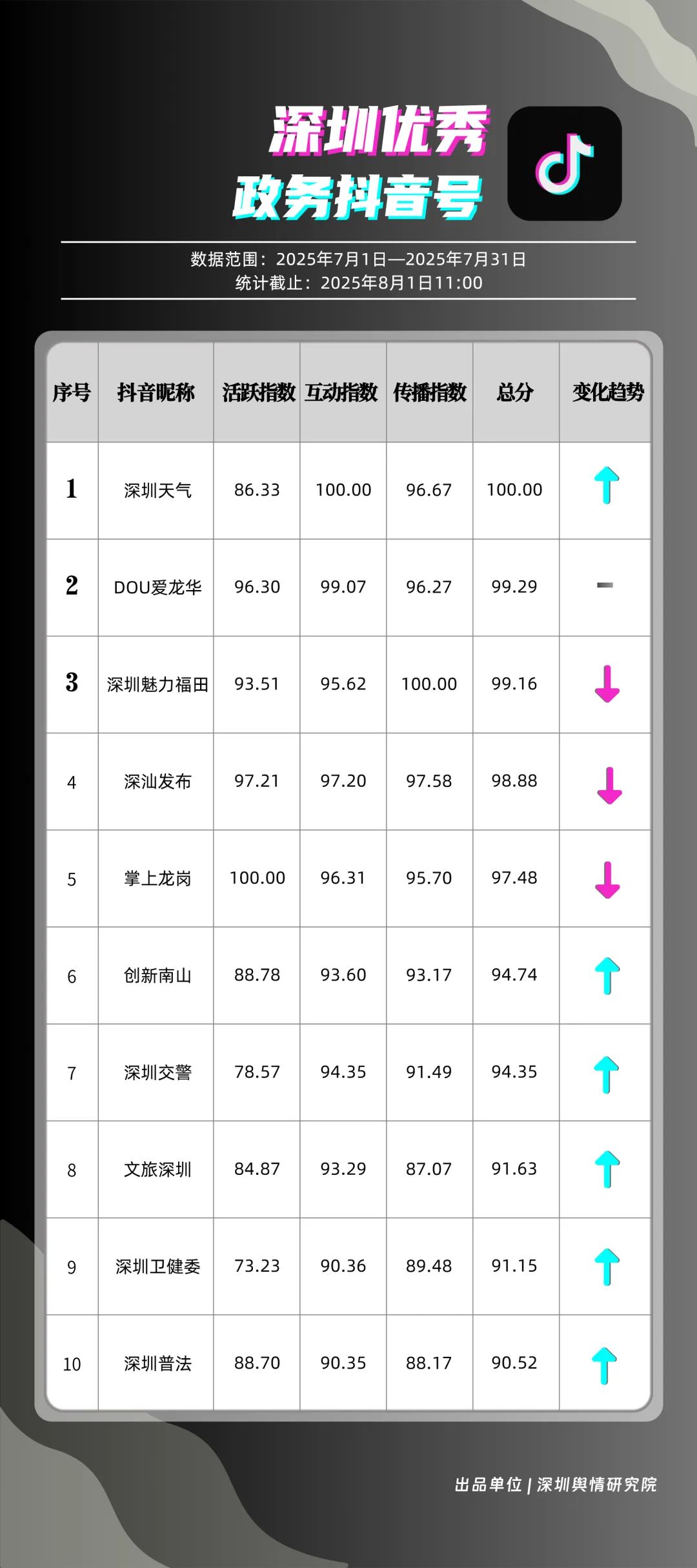 7月,“深圳天氣”“DOU愛龍華”“深圳魅力福田”“深汕發(fā)布”“掌上龍崗”“創(chuàng)新南山”“深圳交警”“文旅深圳”“深圳衛(wèi)健委”“深圳普法”共10個政務(wù)抖音號獲得“優(yōu)秀政務(wù)抖音號”稱號。其中,“深圳天氣”互動指標(biāo)獲滿分,憑借氣象與趣味相結(jié)合的創(chuàng)新科普形式,領(lǐng)跑優(yōu)秀政務(wù)抖音號;“DOU愛龍華”“深圳魅力福田”分別位列第二、三名,通過聚焦網(wǎng)絡(luò)熱點(diǎn)、挖掘創(chuàng)意內(nèi)容,不斷提升傳播效能,展現(xiàn)出強(qiáng)大的政務(wù)新媒體影響力;“深汕發(fā)布”“掌上龍崗”“創(chuàng)新南山”等賬號緊隨其后,上榜的優(yōu)質(zhì)政務(wù)抖音號用短視頻語言強(qiáng)化傳播效果,展現(xiàn)了鮮明的賬號特色和風(fēng)采。