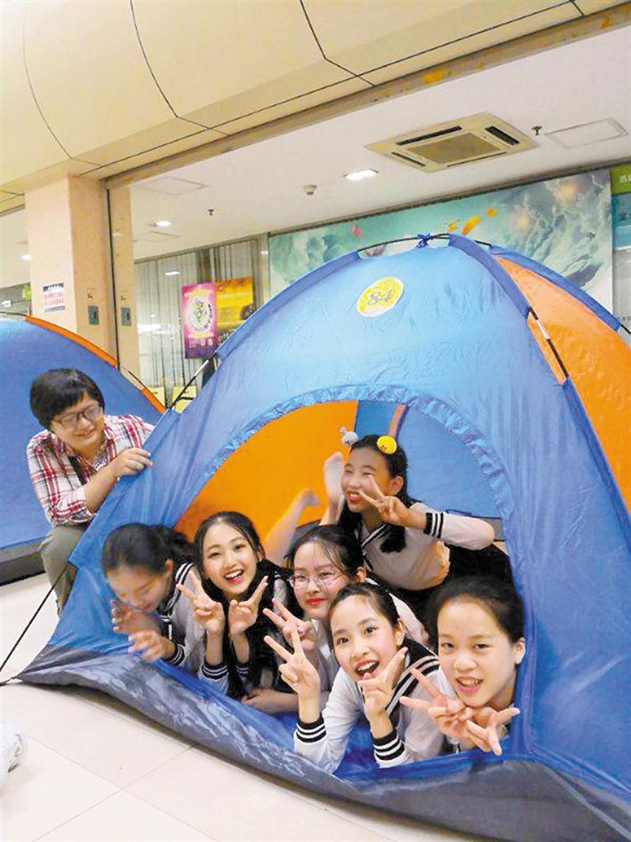 120個(gè)小讀者家庭近日受邀來到深圳少年兒童圖書館,開啟一年一度的“圖書館奇妙夜”。往常晚上8點(diǎn)的深圳少年兒童圖書館是讀者離場之時(shí),當(dāng)晚卻燈火通明,熱鬧伊始。首先迎接小讀者們的是“歡迎晚會”,緊接著,小讀者們進(jìn)入到圖書館分組閱讀之旅中,他們穿行在帳篷營地之間,享受著奇妙閱讀夜的快樂。