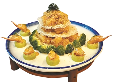 荷塘春月色則以魚肉、蓮子、蛋白、火腿等做出荷塘月色的意境,此菜既突出粵菜“清鮮嫩滑”的特點,更形象顯露出粵菜“優(yōu)雅脫俗”的風格;“荔熟秋蟬鳴”取嶺南佳果元素,何物令得“一騎紅塵妃子笑”?原是荔枝也!粵菜師傅巧妙運用雞胸肉蓉做荔枝來比喻“果”,五花肉切片包卷荔浦芋來比作“蔬”,突出廣東地區(qū)果蔬物產(chǎn)豐富的創(chuàng)作思維;廣東屬沿海地區(qū),蝦本是居民餐桌常見之物,而姜則是粵菜烹飪之引物,“無菜不落姜”已為粵菜師傅的烹調(diào)手法,“金絲伴彩霞”運用多種烹飪法,采用一蝦兩食配以炸姜絲突出粵菜風味。