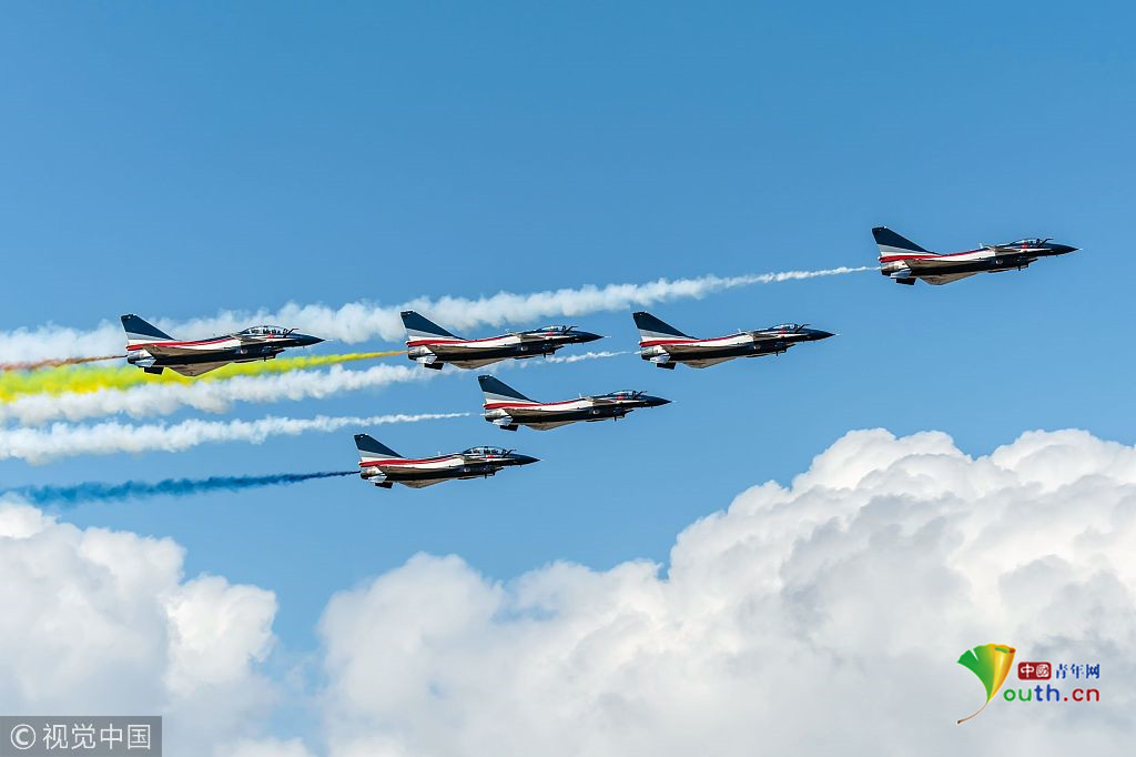 2018年11月8日,廣東珠海,第十二屆中國國際航展第三天。空軍“八一”飛行表演隊(duì)的隊(duì)員們,發(fā)揚(yáng)連續(xù)作戰(zhàn)精神,給觀眾們表演了七機(jī)分組開花、四機(jī)編隊(duì)橫滾等高難動作,受到觀眾們的稱贊。視覺中國