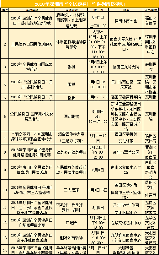 深圳新聞網(wǎng)訊 今年8月8日,是國家設(shè)立“全民健身日”第10年。記者從深圳市文體旅游局獲悉,今年全市將舉辦14項(xiàng)市級(jí)活動(dòng),組織發(fā)動(dòng)2萬余名社會(huì)體育指導(dǎo)員在各區(qū)站點(diǎn)提供免費(fèi)健身服務(wù)指導(dǎo),此外,還將有市、各區(qū)體育場(chǎng)館及大型國民體質(zhì)監(jiān)測(cè)等向市民免費(fèi)開放。