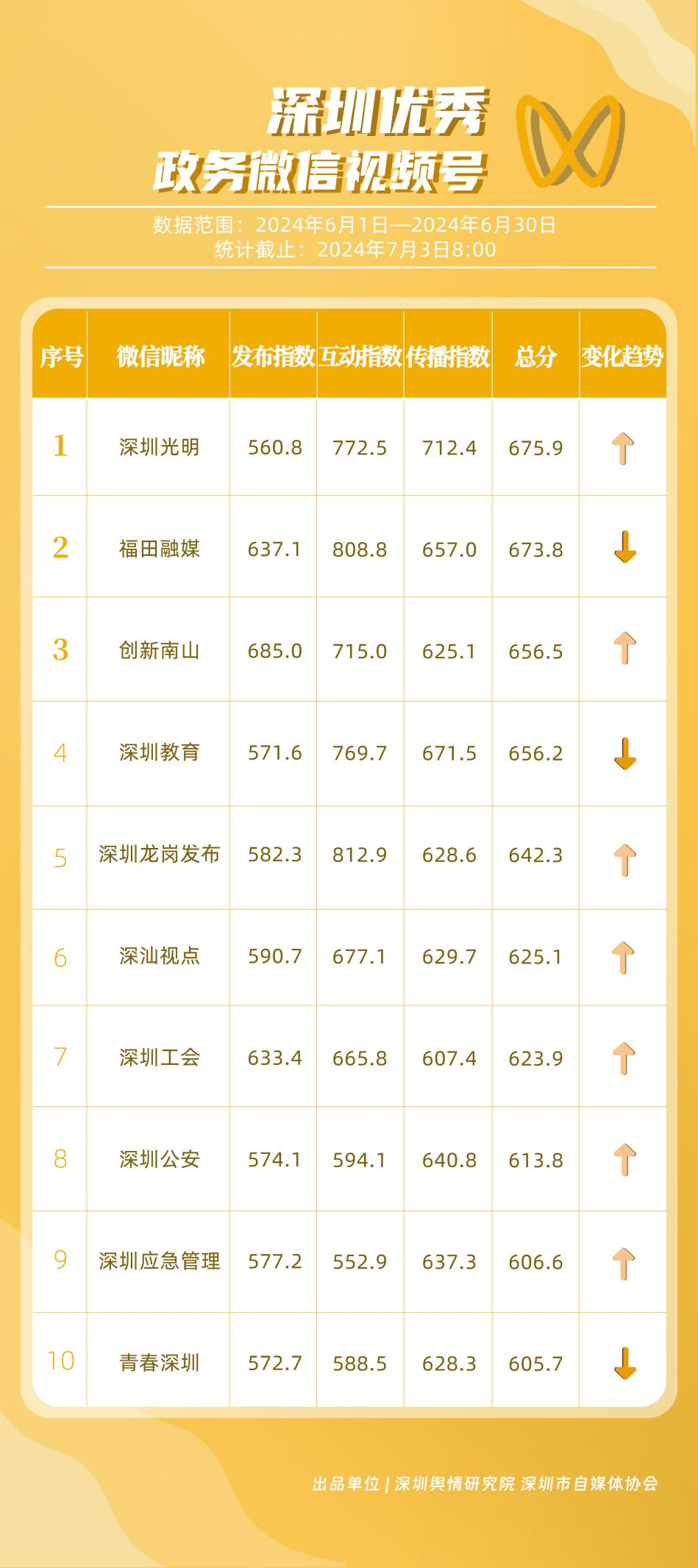 6月,“深圳衛(wèi)健委”“i深圳”“深圳龍崗發(fā)布”“幸福福田”“深圳交通”“深圳教育”“濱海寶安”“創(chuàng)新南山”“深圳工會(huì)”“青春深圳”“同心鵬城”“深圳光明”等30個(gè)政務(wù)微信公眾號(hào),被評(píng)為“深圳優(yōu)秀政務(wù)微信公眾號(hào)”。6月,“深圳衛(wèi)健委”因內(nèi)容策劃出色、受眾互動(dòng)活躍、作品火熱“出圈”等,榮登排行榜首位?!皠?chuàng)新南山”“同心鵬城”“深圳社?!薄吧钲诮逃钡壬习窆娞?hào)也積極創(chuàng)作優(yōu)質(zhì)作品,抓住時(shí)下熱點(diǎn)趨勢(shì),集中發(fā)揮政務(wù)媒體傳播力量,推動(dòng)了政務(wù)信息傳播工作提質(zhì)增效。