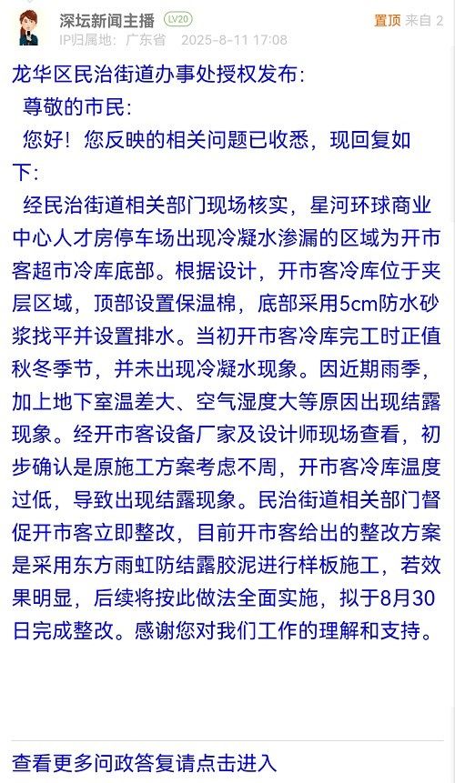 經(jīng)民治街道相關(guān)部門現(xiàn)場核實(shí),星河環(huán)球商業(yè)中心人才房停車場出現(xiàn)冷凝水滲漏的區(qū)域?yàn)殚_市客超市冷庫底部。根據(jù)設(shè)計,開市客冷庫位于夾層區(qū)域,頂部設(shè)置保溫棉,底部采用5cm防水砂漿找平并設(shè)置排水。當(dāng)初開市客冷庫完工時正值秋冬季節(jié),并未出現(xiàn)冷凝水現(xiàn)象。因近期雨季,加上地下室溫差大、空氣濕度大等原因出現(xiàn)結(jié)露現(xiàn)象。經(jīng)開市客設(shè)備廠家及設(shè)計師現(xiàn)場查看,初步確認(rèn)是原施工方案考慮不周,開市客冷庫溫度過低,導(dǎo)致出現(xiàn)結(jié)露現(xiàn)象。民治街道相關(guān)部門督促開市客立即整改,目前開市客給出的整改方案是采用東方雨虹防結(jié)露膠泥進(jìn)行樣板施工,若效果明顯,后續(xù)將按此做法全面實(shí)施,擬于8月30日完成整改。感謝您對我們工作的理解和支持。