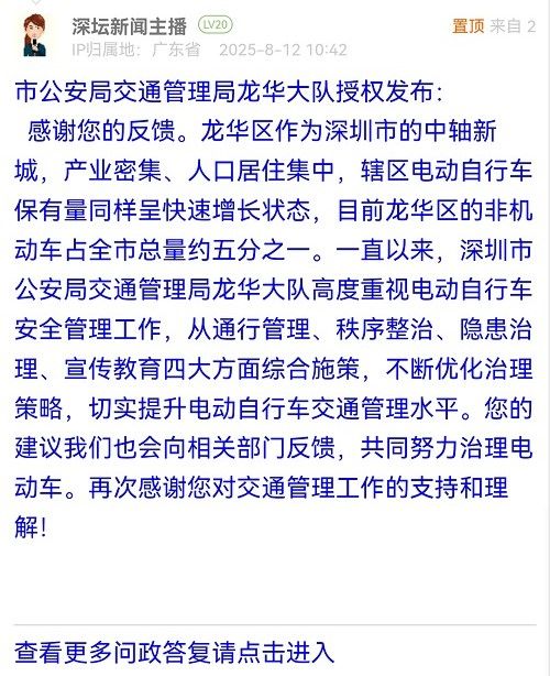 感謝您的反饋。龍華區(qū)作為深圳市的中軸新城,產(chǎn)業(yè)密集、人口居住集中,轄區(qū)電動自行車保有量同樣呈快速增長狀態(tài),目前龍華區(qū)的非機(jī)動車占全市總量約五分之一。一直以來,深圳市公安局交通管理局龍華大隊高度重視電動自行車安全管理工作,從通行管理、秩序整治、隱患治理、宣傳教育四大方面綜合施策,不斷優(yōu)化治理策略,切實(shí)提升電動自行車交通管理水平。您的建議我們也會向相關(guān)部門反饋,共同努力治理電動車。再次感謝您對交通管理工作的支持和理解!