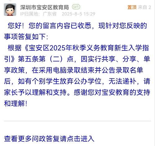 根據(jù)《寶安區(qū)2025年秋季義務(wù)教育新生入學(xué)指引》第五條第(二)點(diǎn),因?qū)嵭泄蚕?、分享、單享政策,在采用電腦錄取結(jié)束并公告錄取名單后,如有個別學(xué)生放棄公辦學(xué)位,無法遞補(bǔ),請家長予以理解和支持。感謝您對寶安教育的支持和理解!