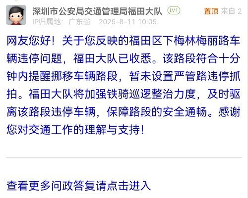 網(wǎng)友您好!關(guān)于您反映的福田區(qū)下梅林梅麗路車輛違停問題,福田大隊已收悉。該路段符合十分鐘內(nèi)提醒挪移車輛路段,暫未設(shè)置嚴(yán)管路違停抓拍。福田大隊將加強(qiáng)鐵騎巡邏整治力度,及時驅(qū)離該路段違停車輛,保障路段的安全通暢。感謝您對交通工作的理解與支持!