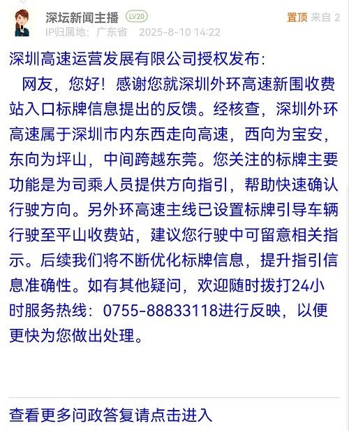網(wǎng)友,您好!感謝您就深圳外環(huán)高速新圍收費(fèi)站入口標(biāo)牌信息提出的反饋。經(jīng)核查,深圳外環(huán)高速屬于深圳市內(nèi)東西走向高速,西向?yàn)閷毎玻瑬|向?yàn)槠荷?,中間跨越東莞。您關(guān)注的標(biāo)牌主要功能是為司乘人員提供方向指引,幫助快速確認(rèn)行駛方向。另外環(huán)高速主線已設(shè)置標(biāo)牌引導(dǎo)車輛行駛至平山收費(fèi)站,建議您行駛中可留意相關(guān)指示。后續(xù)我們將不斷優(yōu)化標(biāo)牌信息,提升指引信息準(zhǔn)確性。如有其他疑問,歡迎隨時撥打24小時服務(wù)熱線:0755-88833118進(jìn)行反映,以便更快為您做出處理。