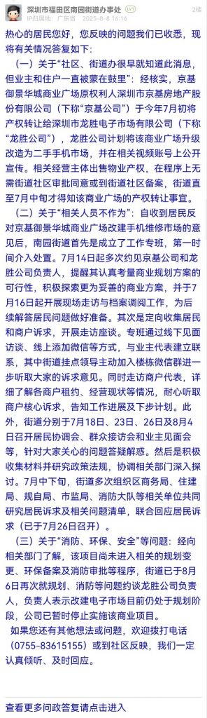 (二)關(guān)于“相關(guān)人員不作為”:自收到居民反對京基御景華城商業(yè)廣場改建手機(jī)維修市場的意見后,南園街道首先是成立了工作專班,第一時間介入處置。7月14日起多次約見京基公司和龍勝公司負(fù)責(zé)人,提醒其認(rèn)真考量商業(yè)規(guī)劃方案的可行性,積極探索更為妥善的商業(yè)方案,并于7月16日起開展現(xiàn)場走訪與檔案調(diào)閱工作,為后續(xù)解答居民問題做好準(zhǔn)備。其次是定向收集居民和商戶訴求,開展走訪座談。專班通過線下見面訪談、線上添加微信等方式,與業(yè)主代表建立聯(lián)系,其中街道掛點(diǎn)領(lǐng)導(dǎo)主動加入樓棟微信群進(jìn)一步聽取大家的訴求意見。同時走訪商戶代表,詳細(xì)了解各商戶租約、經(jīng)營現(xiàn)狀等情況,耐心聽取商戶核心訴求,告知工作進(jìn)展及下步計劃。此外,街道分別于7月18日、23日、26日及8月4日召開居民協(xié)調(diào)會、群眾接訪會和業(yè)主見面會等,針對大家關(guān)心的問題答疑解惑。然后是積極收集材料并研究政策法規(guī),協(xié)調(diào)相關(guān)部門深入探討。7月中下旬,街道多次組織區(qū)商務(wù)局、住建局、規(guī)自局、市監(jiān)局、消防大隊等相關(guān)單位共同研究居民訴求及相關(guān)問題清單,聯(lián)合回應(yīng)居民訴求(已于7月26日召開)。