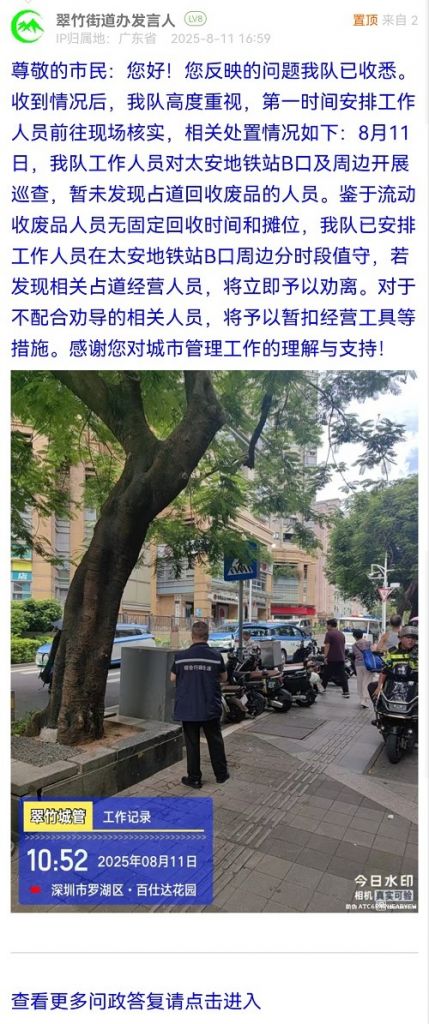 尊敬的市民:您好!您反映的問題我隊已收悉。收到情況后,我隊高度重視,第一時間安排工作人員前往現(xiàn)場核實(shí),相關(guān)處置情況如下:8月11日,我隊工作人員對太安地鐵站B口及周邊開展巡查,暫未發(fā)現(xiàn)占道回收廢品的人員。鑒于流動收廢品人員無固定回收時間和攤位,我隊已安排工作人員在太安地鐵站B口周邊分時段值守,若發(fā)現(xiàn)相關(guān)占道經(jīng)營人員,將立即予以勸離。對于不配合勸導(dǎo)的相關(guān)人員,將予以暫扣經(jīng)營工具等措施。感謝您對城市管理工作的理解與支持!