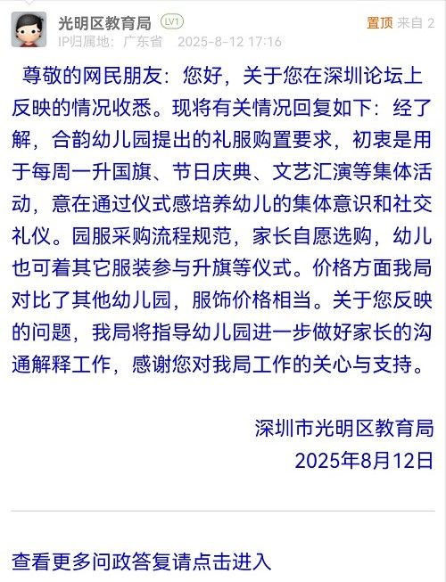尊敬的網(wǎng)民朋友:您好,關(guān)于您在深圳論壇上反映的情況收悉。現(xiàn)將有關(guān)情況回復(fù)如下:經(jīng)了解,合韻幼兒園提出的禮服購置要求,初衷是用于每周一升國旗、節(jié)日慶典、文藝匯演等集體活動,意在通過儀式感培養(yǎng)幼兒的集體意識和社交禮儀。園服采購流程規(guī)范,家長自愿選購,幼兒也可著其它服裝參與升旗等儀式。價格方面我局對比了其他幼兒園,服飾價格相當(dāng)。關(guān)于您反映的問題,我局將指導(dǎo)幼兒園進(jìn)一步做好家長的溝通解釋工作,感謝您對我局工作的關(guān)心與支持。