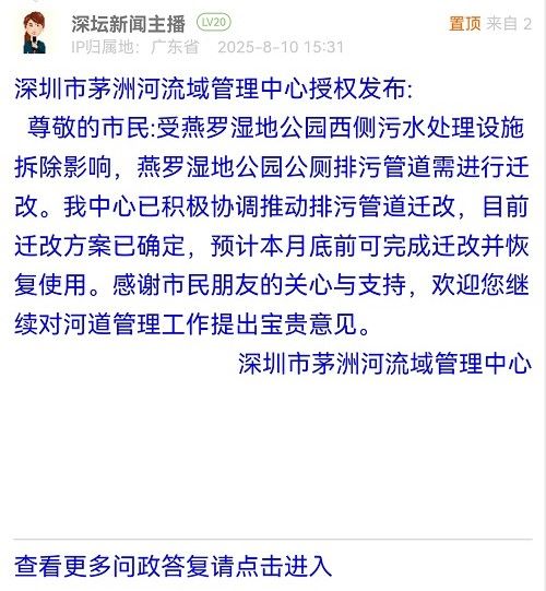 尊敬的市民:受燕羅濕地公園西側(cè)污水處理設(shè)施拆除影響,燕羅濕地公園公廁排污管道需進(jìn)行遷改。我中心已積極協(xié)調(diào)推動排污管道遷改,目前遷改方案已確定,預(yù)計本月底前可完成遷改并恢復(fù)使用。感謝市民朋友的關(guān)心與支持,歡迎您繼續(xù)對河道管理工作提出寶貴意見。