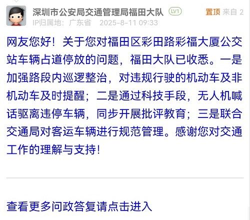 網(wǎng)友您好!關(guān)于您對福田區(qū)彩田路彩福大廈公交站車輛占道停放的問題,福田大隊已收悉。一是加強(qiáng)路段內(nèi)巡邏整治,對違規(guī)行駛的機(jī)動車及非機(jī)動車及時提醒;二是通過科技手段,無人機(jī)喊話驅(qū)離違停車輛,同步開展批評教育;三是聯(lián)合交通局對客運(yùn)車輛進(jìn)行規(guī)范管理。感謝您對交通工作的理解與支持!