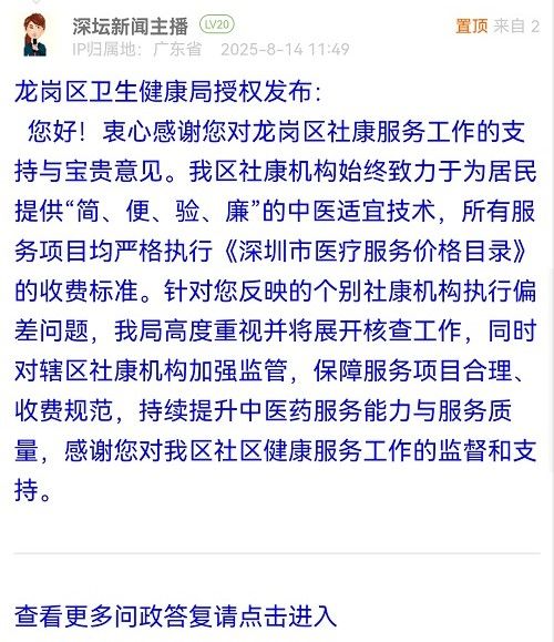 您好!衷心感謝您對龍崗區(qū)社康服務(wù)工作的支持與寶貴意見。我區(qū)社康機構(gòu)始終致力于為居民提供“簡、便、驗、廉”的中醫(yī)適宜技術(shù),所有服務(wù)項目均嚴(yán)格執(zhí)行《深圳市醫(yī)療服務(wù)價格目錄》的收費標(biāo)準(zhǔn)。針對您反映的個別社康機構(gòu)執(zhí)行偏差問題,我局高度重視并將展開核查工作,同時對轄區(qū)社康機構(gòu)加強監(jiān)管,保障服務(wù)項目合理、收費規(guī)范,持續(xù)提升中醫(yī)藥服務(wù)能力與服務(wù)質(zhì)量,感謝您對我區(qū)社區(qū)健康服務(wù)工作的監(jiān)督和支持。