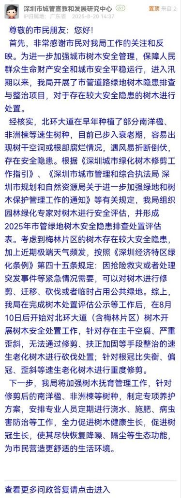 經(jīng)核實,北環(huán)大道在早年種植了部分南洋楹、非洲楝等速生樹種,目前已步入衰老期,容易出現(xiàn)樹干空洞或根部腐爛情況,遇風(fēng)易折斷倒伏,存在安全隱患。根據(jù)《深圳城市綠化樹木修剪工作指引》、《深圳市城市管理和綜合執(zhí)法局 深圳市規(guī)劃和自然資源局關(guān)于進一步加強綠地和樹木保護管理工作的通知》等有關(guān)規(guī)定,我局組織園林綠化專家對樹木進行安全評估,并形成2025年市管綠地樹木安全隱患排查處置評估表。考慮到梅林片區(qū)的樹木存在較大安全隱患,加上近期極端天氣頻發(fā),按照《深圳經(jīng)濟特區(qū)綠化條例》第四十五條規(guī)定:因搶險救災(zāi)或者處理突發(fā)事件等緊急情況需要,可以對樹木進行修剪、遷移、砍伐或者臨時占用公共綠地。綜上,我局在完成樹木處置評估公示等工作后,在8月10日后開始對北環(huán)大道(含梅林片區(qū))樹木開展樹木安全處置工作,針對存在主干空腐、嚴(yán)重歪斜,無法通過修剪、扶正加固等手段整治的速生老化樹木進行砍伐處置;針對根冠比失衡、偏冠、歪斜等速生老化樹木進行重度修剪。