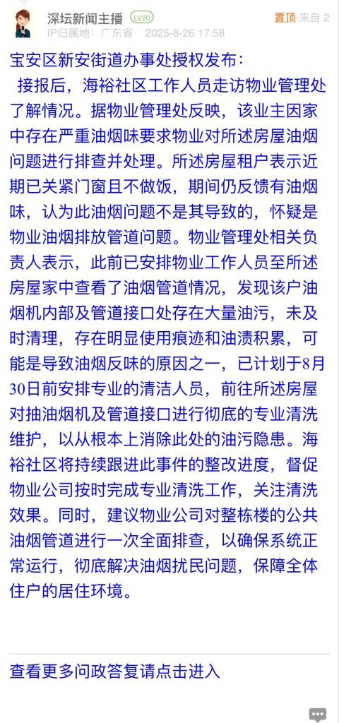 接報(bào)后,海裕社區(qū)工作人員走訪物業(yè)管理處了解情況。據(jù)物業(yè)管理處反映,該業(yè)主因家中存在嚴(yán)重油煙味要求物業(yè)對所述房屋油煙問題進(jìn)行排查并處理。所述房屋租戶表示近期已關(guān)緊門窗且不做飯,期間仍反饋有油煙味,認(rèn)為此油煙問題不是其導(dǎo)致的,懷疑是物業(yè)油煙排放管道問題。物業(yè)管理處相關(guān)負(fù)責(zé)人表示,此前已安排物業(yè)工作人員至所述房屋家中查看了油煙管道情況,發(fā)現(xiàn)該戶油煙機(jī)內(nèi)部及管道接口處存在大量油污,未及時清理,存在明顯使用痕跡和油漬積累,可能是導(dǎo)致油煙反味的原因之一,已計(jì)劃于8月30日前安排專業(yè)的清潔人員,前往所述房屋對抽油煙機(jī)及管道接口進(jìn)行徹底的專業(yè)清洗維護(hù),以從根本上消除此處的油污隱患。海裕社區(qū)將持續(xù)跟進(jìn)此事件的整改進(jìn)度,督促物業(yè)公司按時完成專業(yè)清洗工作,關(guān)注清洗效果。同時,建議物業(yè)公司對整棟樓的公共油煙管道進(jìn)行一次全面排查,以確保系統(tǒng)正常運(yùn)行,徹底解決油煙擾民問題,保障全體住戶的居住環(huán)境。