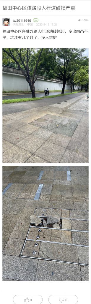 8. 帖文《福田中心區(qū)該路段人行道破損嚴(yán)重》