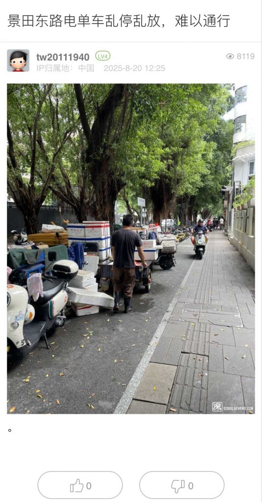 網(wǎng)友您好,您反映的問題我們已收悉,現(xiàn)將有關(guān)情況答復(fù)如下:接到反映的情況后,街道已進(jìn)一步加強(qiáng)對景田東路沿線人行道的巡查力度,并在人行道上進(jìn)行“隨手扶”,將隨意停放的共享單車、非機(jī)動車逐一規(guī)范擺放至劃線區(qū)域內(nèi);后續(xù),街道將繼續(xù)安排巡查人員與社區(qū)網(wǎng)格員聯(lián)動常態(tài)化對該區(qū)域開展巡查,開展“隨手扶”,規(guī)整超出停車劃線區(qū)域的非機(jī)動車,在滿足市民正常使用需求的同時,確保道路暢通、行人出行安全,共同創(chuàng)建和諧安全的社區(qū)生活環(huán)境。