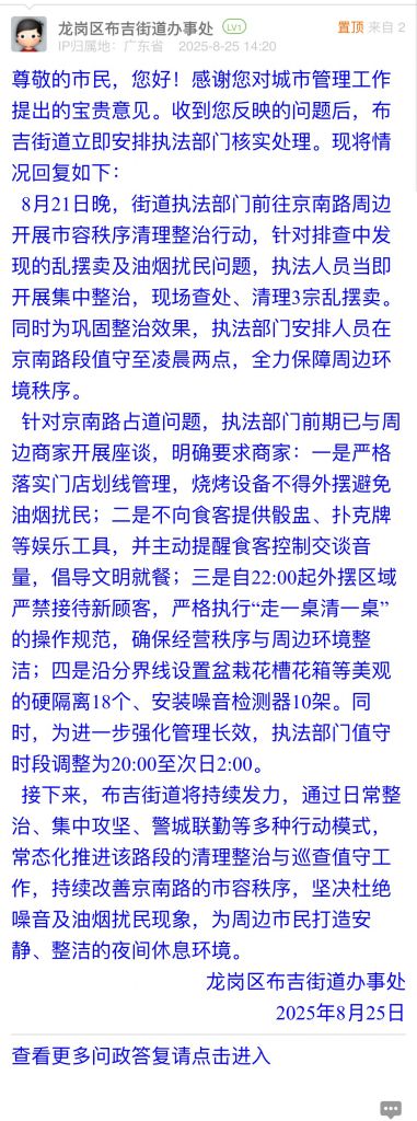 接下來,布吉街道將持續(xù)發(fā)力,通過日常整治、集中攻堅(jiān)、警城聯(lián)勤等多種行動模式,常態(tài)化推進(jìn)該路段的清理整治與巡查值守工作,持續(xù)改善京南路的市容秩序,堅(jiān)決杜絕噪音及油煙擾民現(xiàn)象,為周邊市民打造安靜、整潔的夜間休息環(huán)境。