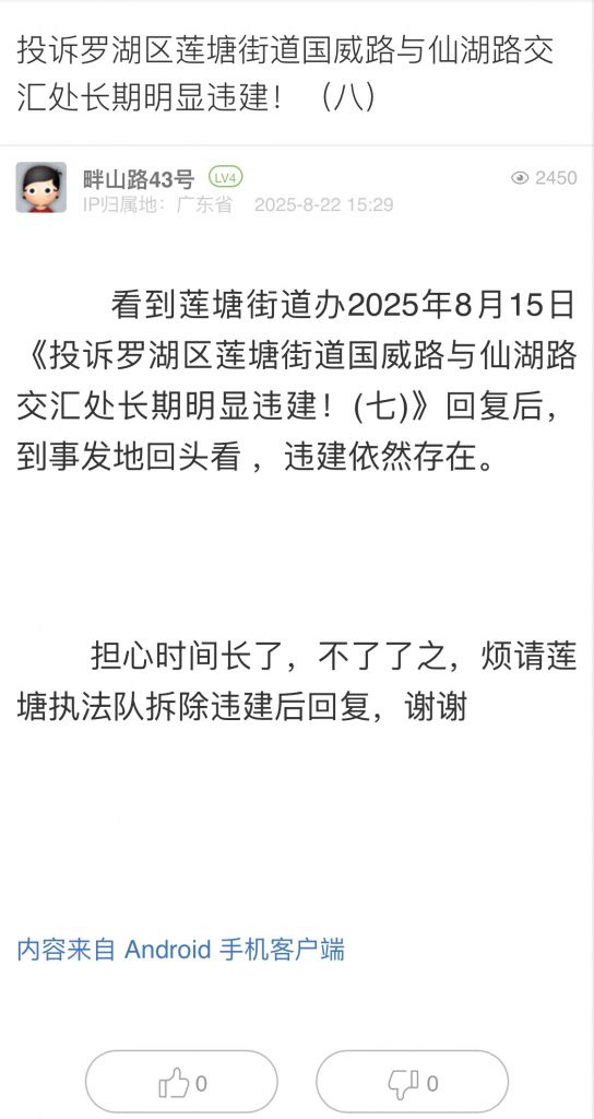 3. 帖文《投訴羅湖區(qū)蓮塘街道聚寶路仙湖楓景長期明顯違建?。ㄎ澹?/a>》