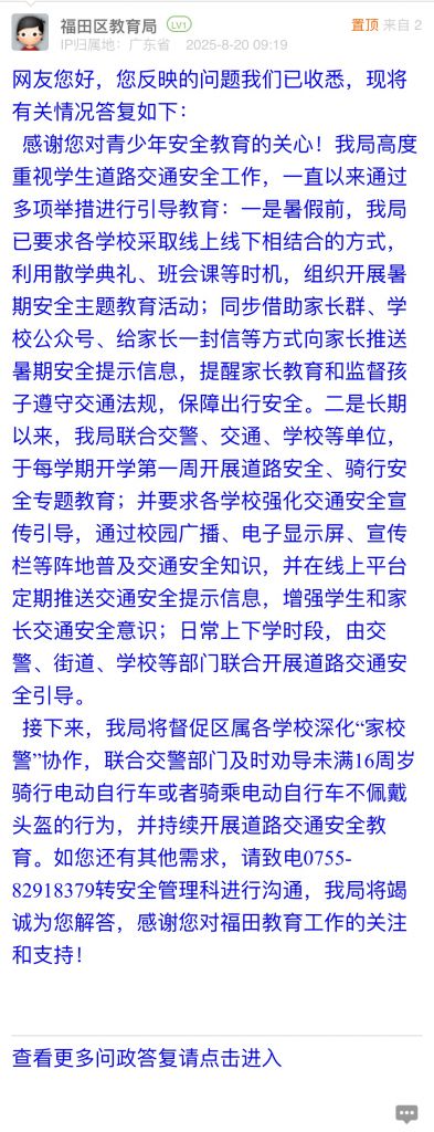 接下來,我局將督促區(qū)屬各學(xué)校深化“家校警”協(xié)作,聯(lián)合交警部門及時勸導(dǎo)未滿16周歲騎行電動自行車或者騎乘電動自行車不佩戴頭盔的行為,并持續(xù)開展道路交通安全教育。如您還有其他需求,請致電0755-82918379轉(zhuǎn)安全管理科進(jìn)行溝通,我局將竭誠為您解答,感謝您對福田教育工作的關(guān)注和支持!