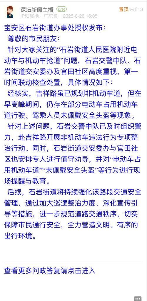 針對大家關(guān)注的“石巖街道人民醫(yī)院附近電動車與機(jī)動車搶道”問題,石巖交警中隊(duì)、石巖街道交安委辦及官田社區(qū)高度重視,第一時間聯(lián)動核查處置,具體情況如下: