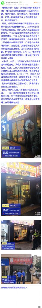 經(jīng)查,您所反映的店鋪位于粵海新村7棟一樓小區(qū)內(nèi)的“阿健烤鮮牛肉”。2025年8月1日收到相關(guān)線索后,我隊(duì)工作人員立即趕赴現(xiàn)場核實(shí)。當(dāng)日未發(fā)現(xiàn)該店將燒烤車擺放門口經(jīng)營的情況。工作人員已現(xiàn)場向該店經(jīng)營人員普法,強(qiáng)調(diào)根據(jù)相關(guān)規(guī)定,任何單位和個人不得擅自占用城市道路、廣場等公共場所堆放物料、占道經(jīng)營。并督促該店經(jīng)營人員盡快加裝油煙凈化器,減少對周邊居民的影響,切實(shí)維護(hù)鄰里和諧。8月14日,我隊(duì)檢查該店油煙凈化器安裝情況,確認(rèn)其已安裝完畢并投入使用。
