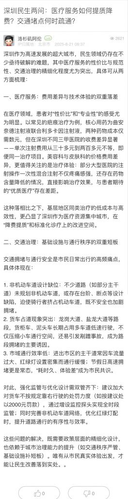 15. 帖文《深圳民生兩問:醫(yī)療服務(wù)如何提質(zhì)降費(fèi)?交通堵點(diǎn)何時疏通?》