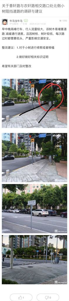 40. 帖文《關(guān)于香軒路與農(nóng)軒路相交路口處北側(cè)小樹阻擋道路的調(diào)研與建議》