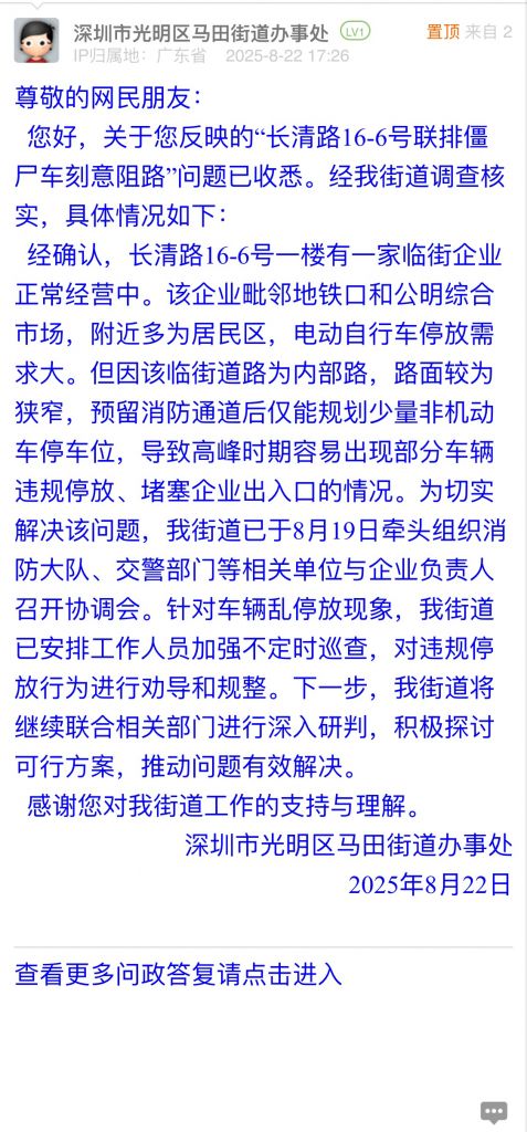 經(jīng)確認(rèn),長清路16-6號一樓有一家臨街企業(yè)正常經(jīng)營中。該企業(yè)毗鄰地鐵口和公明綜合市場,附近多為居民區(qū),電動自行車停放需求大。但因該臨街道路為內(nèi)部路,路面較為狹窄,預(yù)留消防通道后僅能規(guī)劃少量非機(jī)動車停車位,導(dǎo)致高峰時期容易出現(xiàn)部分車輛違規(guī)停放、堵塞企業(yè)出入口的情況。為切實(shí)解決該問題,我街道已于8月19日牽頭組織消防大隊(duì)、交警部門等相關(guān)單位與企業(yè)負(fù)責(zé)人召開協(xié)調(diào)會。針對車輛亂停放現(xiàn)象,我街道已安排工作人員加強(qiáng)不定時巡查,對違規(guī)停放行為進(jìn)行勸導(dǎo)和規(guī)整。下一步,我街道將繼續(xù)聯(lián)合相關(guān)部門進(jìn)行深入研判,積極探討可行方案,推動問題有效解決。