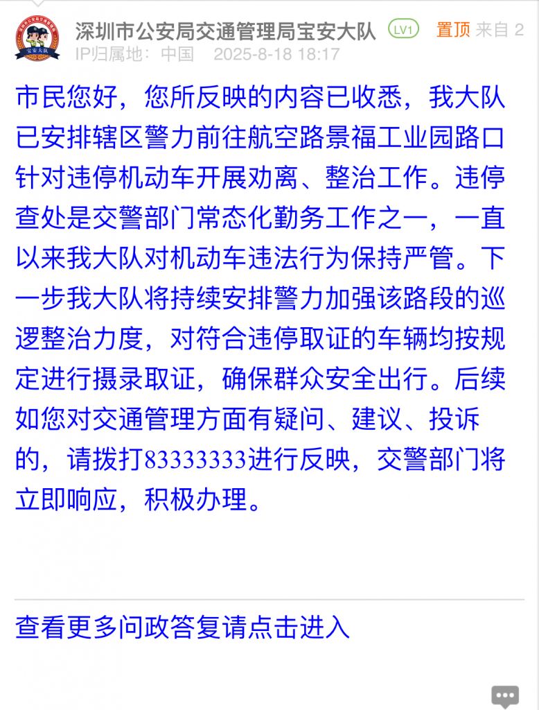 市民您好,您所反映的內(nèi)容已收悉,我大隊(duì)已安排轄區(qū)警力前往航空路景福工業(yè)園路口針對違停機(jī)動車開展勸離、整治工作。違停查處是交警部門常態(tài)化勤務(wù)工作之一,一直以來我大隊(duì)對機(jī)動車違法行為保持嚴(yán)管。下一步我大隊(duì)將持續(xù)安排警力加強(qiáng)該路段的巡邏整治力度,對符合違停取證的車輛均按規(guī)定進(jìn)行攝錄取證,確保群眾安全出行。后續(xù)如您對交通管理方面有疑問、建議、投訴的,請撥打83333333進(jìn)行反映,交警部門將立即響應(yīng),積極辦理。