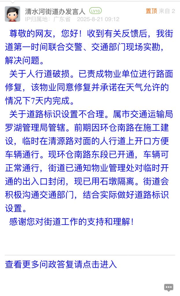 關(guān)于道路標(biāo)識設(shè)置不合理。屬市交通運(yùn)輸局羅湖管理局管轄。前期因環(huán)倉南路在施工建設(shè),臨時在清源路對面的人行道上開口方便車輛通行?,F(xiàn)環(huán)倉南路東段已開通,車輛可正常通行,街道已通知物業(yè)管理處對臨時開通的出入口封閉,現(xiàn)已用石墩隔離。街道會積極溝通交通部門,結(jié)合實(shí)際做好道路標(biāo)識設(shè)置。