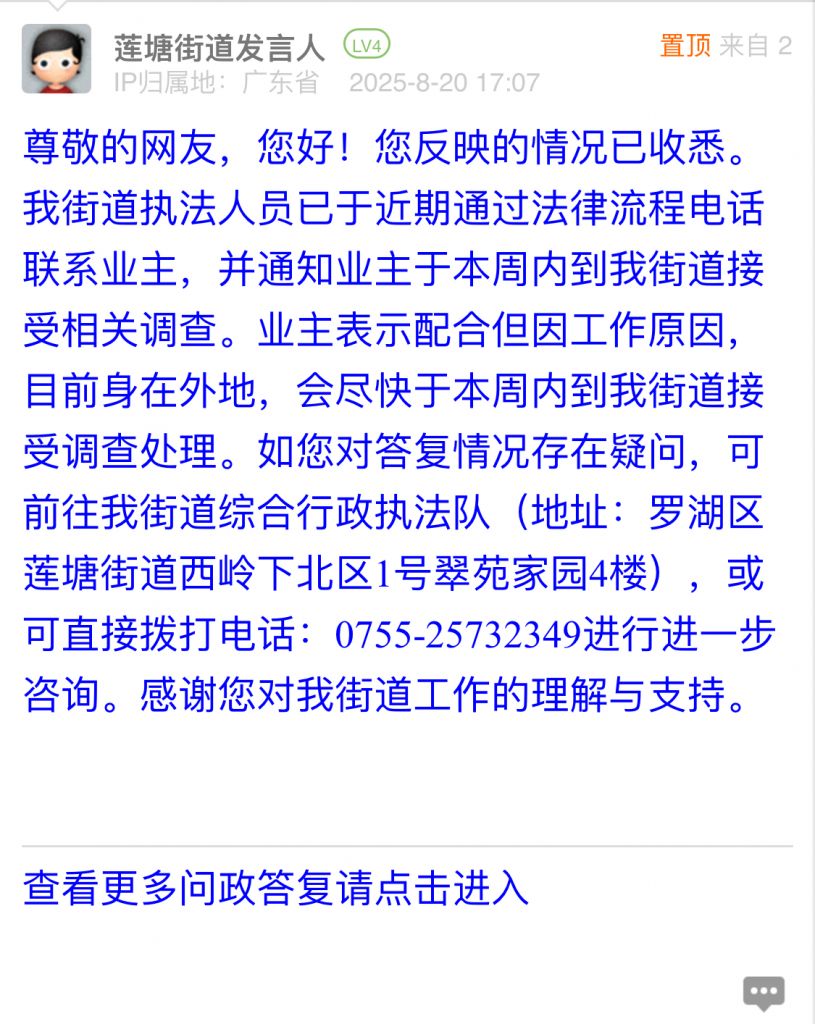 尊敬的網(wǎng)友,您好!您反映的情況已收悉。我街道執(zhí)法人員已于近期通過法律流程電話聯(lián)系業(yè)主,并通知業(yè)主于本周內(nèi)到我街道接受相關(guān)調(diào)查。業(yè)主表示配合但因工作原因,目前身在外地,會盡快于本周內(nèi)到我街道接受調(diào)查處理。如您對答復(fù)情況存在疑問,可前往我街道綜合行政執(zhí)法隊(duì)(地址:羅湖區(qū)蓮塘街道西嶺下北區(qū)1號翠苑家園4樓),或可直接撥打電話:0755-25732349進(jìn)行進(jìn)一步咨詢。感謝您對我街道工作的理解與支持。