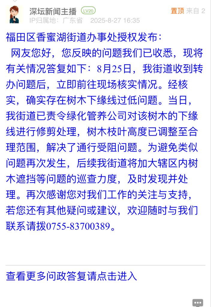 網(wǎng)友您好,您反映的問題我們已收悉,現(xiàn)將有關(guān)情況答復(fù)如下:8月25日,我街道收到轉(zhuǎn)辦問題后,立即前往現(xiàn)場核實(shí)情況。經(jīng)核實(shí),確實(shí)存在樹木下緣線過低問題。當(dāng)日,我街道已責(zé)令綠化管養(yǎng)公司對該樹木的下緣線進(jìn)行修剪處理,樹木枝葉高度已調(diào)整至合理范圍,解決了通行受阻問題。為避免類似問題再次發(fā)生,后續(xù)我街道將加大轄區(qū)內(nèi)樹木遮擋等問題的巡查力度,及時發(fā)現(xiàn)并處理。再次感謝您對我們工作的關(guān)注與支持,若您還有其他疑問或建議,歡迎隨時與我們聯(lián)系請撥0755-83700389。