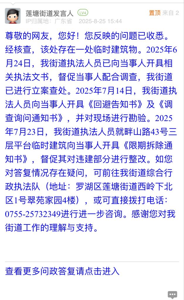 尊敬的網(wǎng)友,您好!您反映的問題已收悉。經(jīng)核查,該處存在一處臨時建筑物。2025年6月24日,我街道執(zhí)法人員已向當(dāng)事人開具相關(guān)執(zhí)法文書,督促當(dāng)事人配合調(diào)查,我街道已進(jìn)行立案查處。2025年7月14日,我街道執(zhí)法人員向當(dāng)事人開具《回避告知書》及《調(diào)查詢問通知書》,并對現(xiàn)場進(jìn)行勘驗(yàn)。2025年7月23日,我街道執(zhí)法人員就畔山路43號三層平臺臨時建筑向當(dāng)事人開具《限期拆除通知書》,督促其對違建部分進(jìn)行整改。如您對答復(fù)情況存在疑問,可前往我街道綜合行政執(zhí)法隊(duì)(地址:羅湖區(qū)蓮塘街道西嶺下北區(qū)1號翠苑家園4樓),或可直接撥打電話:0755-25732349進(jìn)行進(jìn)一步咨詢。感謝您對我街道工作的理解與支持。