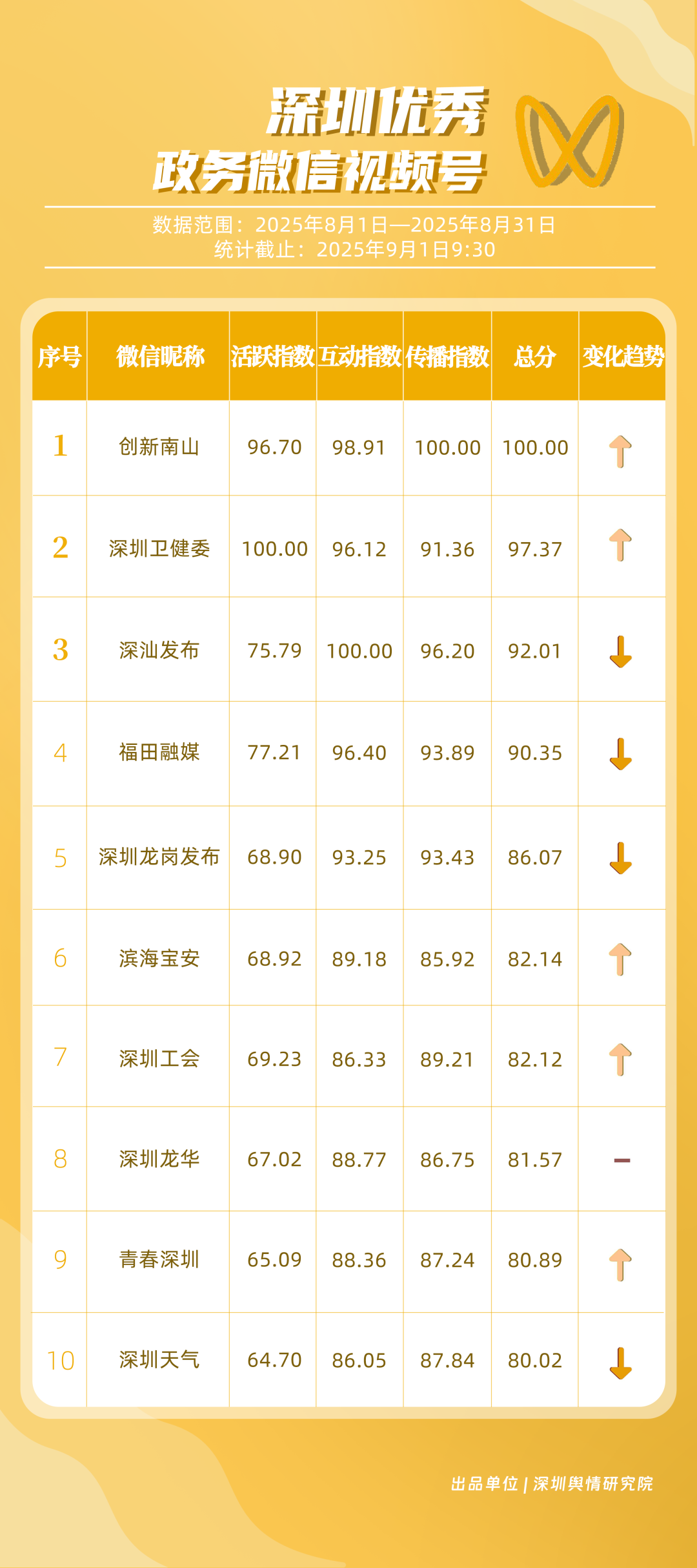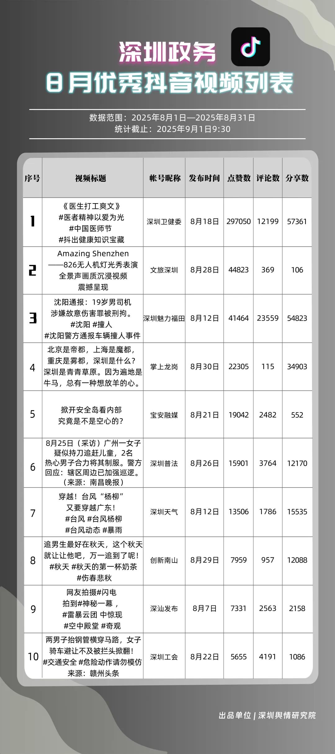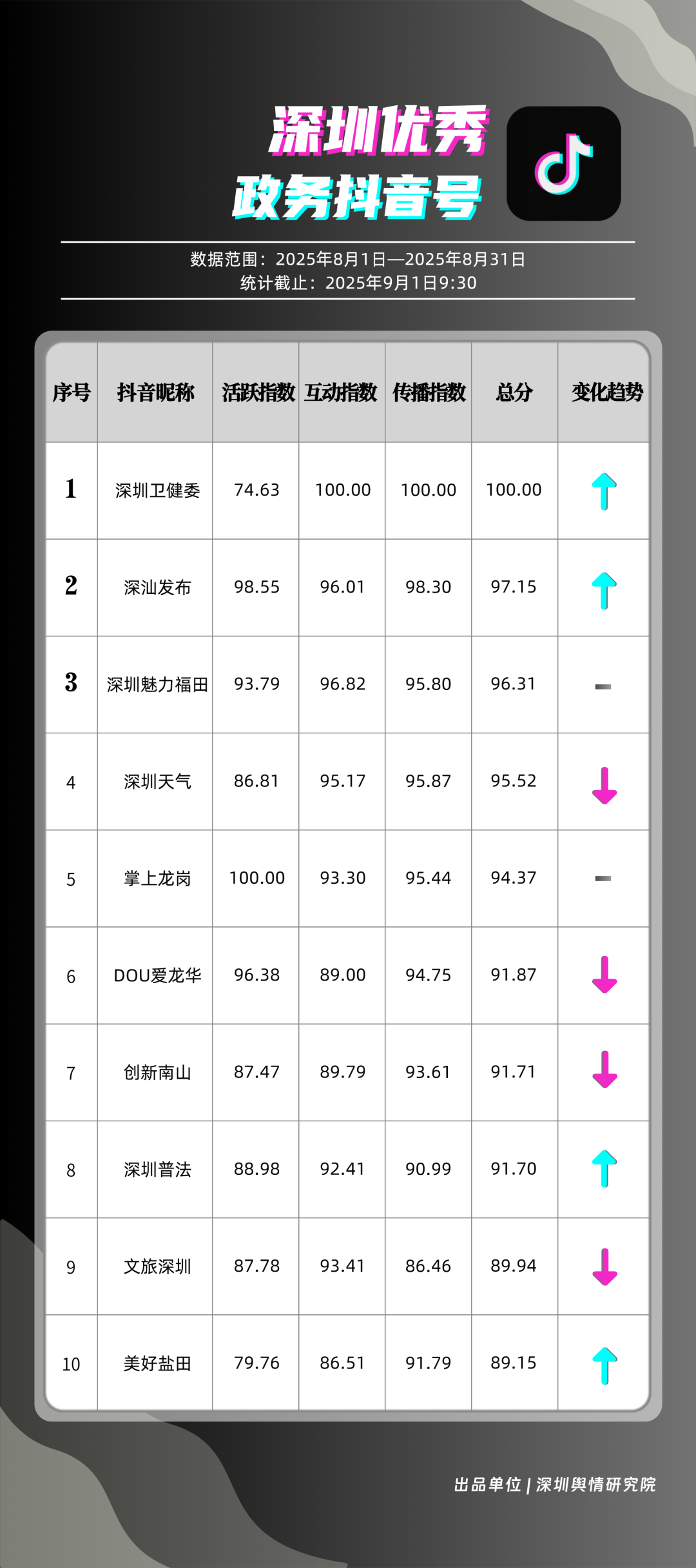 8月,“深圳衛(wèi)健委”“深汕發(fā)布”“深圳魅力福田”“深圳天氣”“掌上龍崗”“DOU愛龍華”“創(chuàng)新南山”“深圳普法”“文旅深圳”“美好鹽田”共10個政務(wù)抖音號獲得“優(yōu)秀政務(wù)抖音號”稱號?!吧钲谛l(wèi)健委”內(nèi)容吸引大量網(wǎng)民關(guān)注,4條視頻累計獲得超50萬次點(diǎn)贊,排名從上期的第九名上升至第一名;“深汕發(fā)布”憑借較高的傳播指數(shù)評分,位列第二名,排名有所上升?!吧钲邝攘ΩL铩薄吧钲谔鞖狻钡荣~號緊隨其后,得分均在95分左右。上榜的優(yōu)秀政務(wù)抖音號深耕優(yōu)質(zhì)創(chuàng)作,精準(zhǔn)把握網(wǎng)民興趣點(diǎn),使作品收獲高點(diǎn)贊、高轉(zhuǎn)發(fā),推動評論區(qū)形成良性互動氛圍,以優(yōu)秀內(nèi)容提升政務(wù)傳播效能。