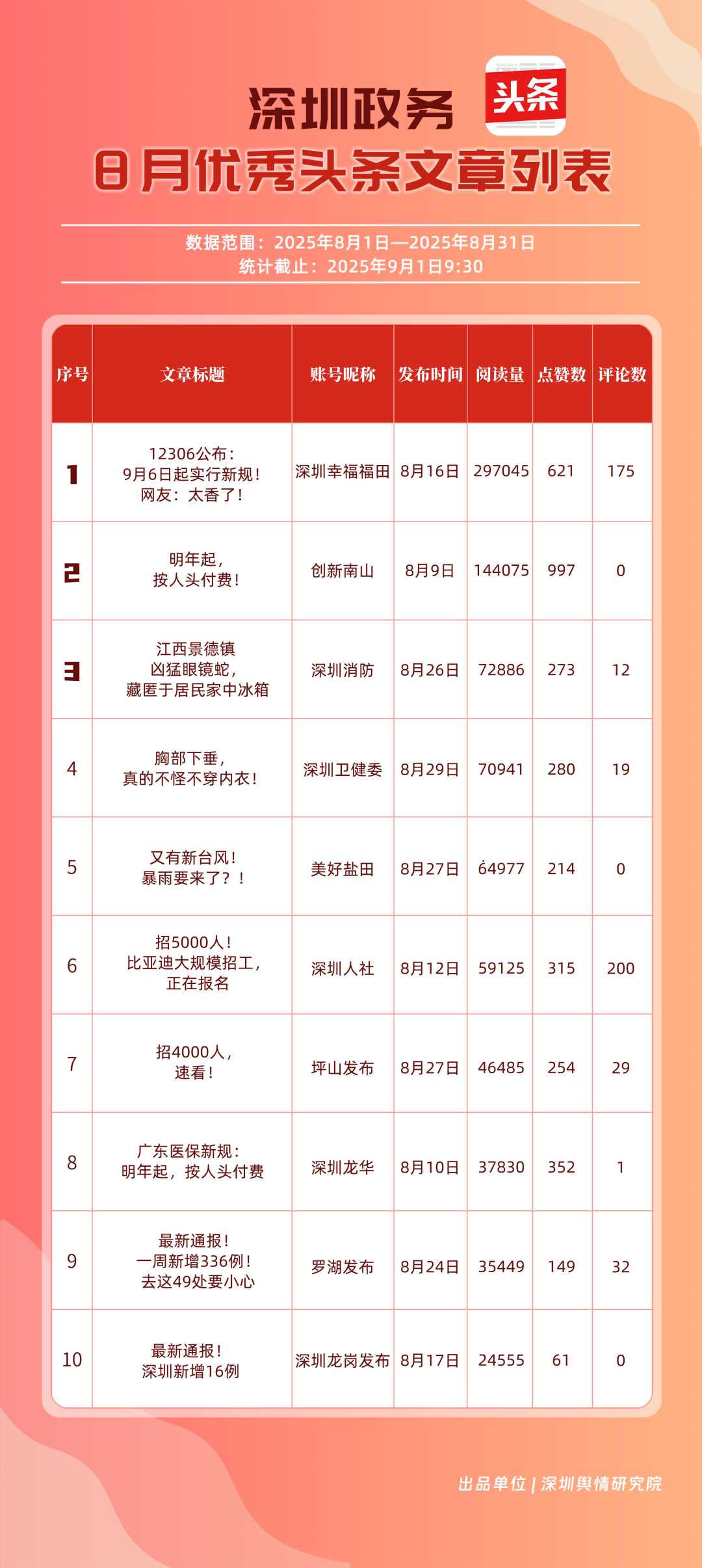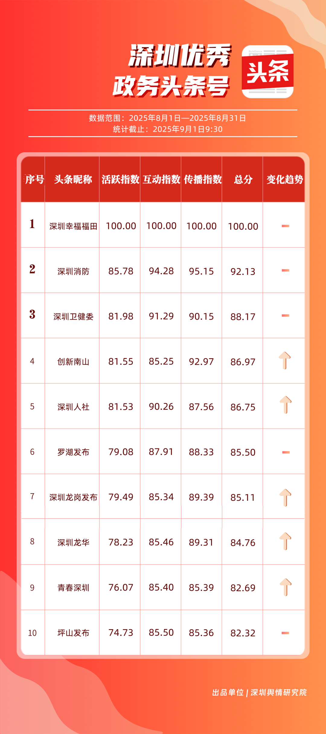 8月,“深圳幸福福田”“深圳消防”“深圳衛(wèi)健委”“創(chuàng)新南山”“深圳人社”“羅湖發(fā)布”“深圳龍崗發(fā)布”“深圳龍華”“青春深圳”“坪山發(fā)布”共10個政務(wù)頭條號入選“優(yōu)秀政務(wù)頭條號”榜單?!吧钲谛腋8L铩睉{借持續(xù)優(yōu)異的綜合表現(xiàn),以滿分成績穩(wěn)居榜單首位,彰顯出強(qiáng)大的政務(wù)傳播力與影響力;“深圳消防”“深圳衛(wèi)健委”則以穩(wěn)定的內(nèi)容質(zhì)量與深厚的民眾基礎(chǔ),持續(xù)為市民提供權(quán)威、及時的服務(wù)信息,排名穩(wěn)固?!皠?chuàng)新南山”“深圳人社”等上榜賬號亦表現(xiàn)亮眼,聚焦民生服務(wù)傳遞政策溫度,共同構(gòu)成政務(wù)新媒體矩陣的中堅力量,為城市治理與民生服務(wù)注入鮮活動能。