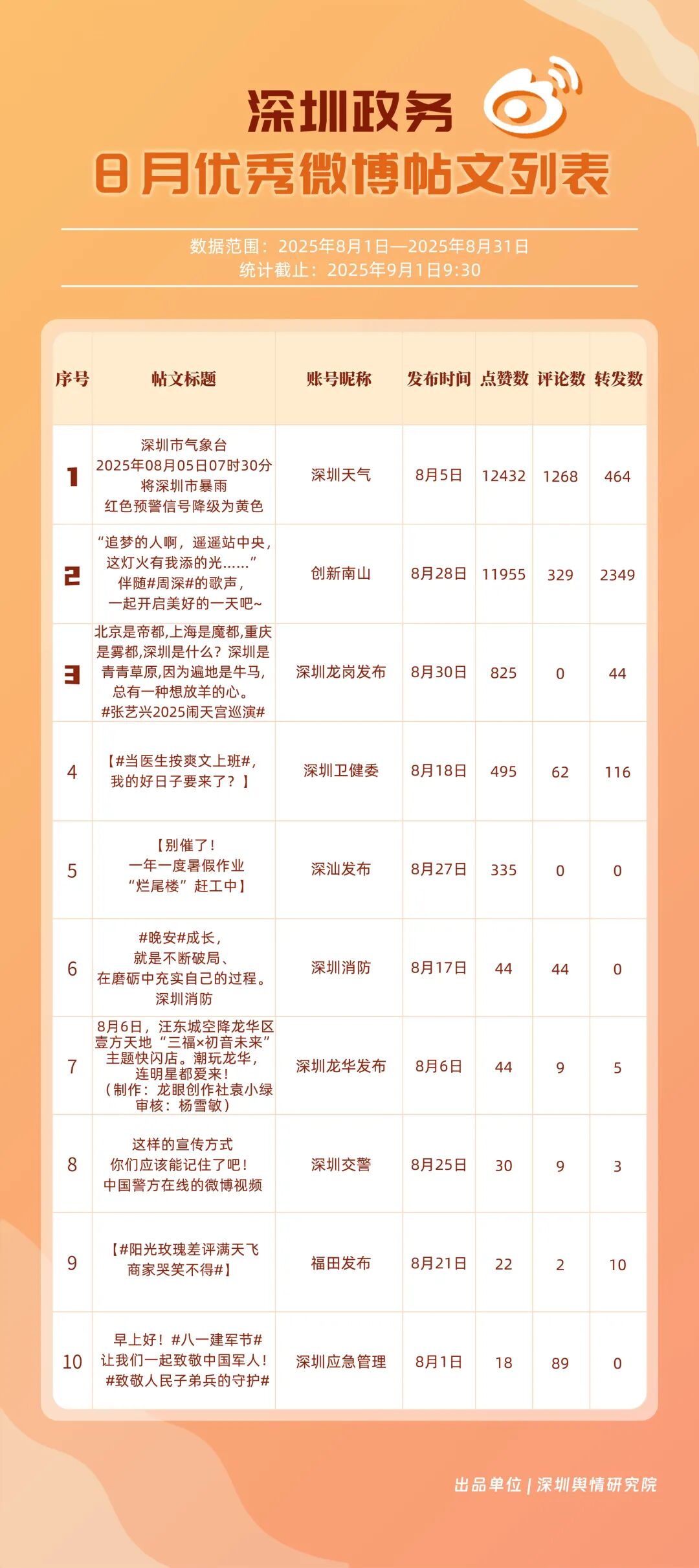 8月,“深圳天氣”“創(chuàng)新南山”“深圳消防”“深圳衛(wèi)健委”“深圳龍崗發(fā)布”“福田發(fā)布”“深汕發(fā)布”“深圳公安”“深圳應(yīng)急管理”“深圳交警”等20個賬號入選“優(yōu)秀政務(wù)微博號”。其中,“深圳天氣”持續(xù)以優(yōu)質(zhì)內(nèi)容受到網(wǎng)民肯定,蟬聯(lián)榜首;“創(chuàng)新南山”傳播指數(shù)得分再提升,總分96.45,排名保持在第二位;“深圳消防”積極發(fā)布消防相關(guān)內(nèi)容,以93.25分位列第三。上榜優(yōu)秀政務(wù)微博賬號精準(zhǔn)把握網(wǎng)民興趣點(diǎn),內(nèi)容獨(dú)具風(fēng)采,收獲網(wǎng)民認(rèn)可,實(shí)現(xiàn)了較好的傳播效果。