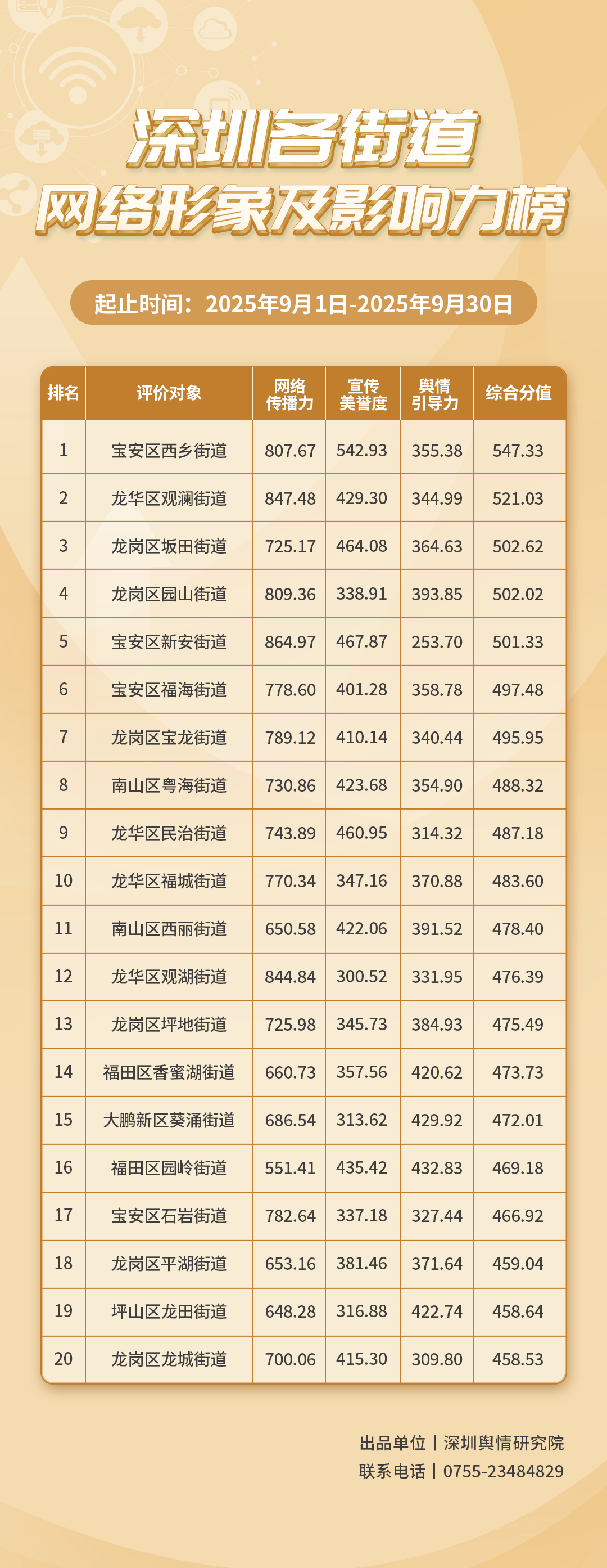 為深入了解深圳市各街道的網(wǎng)絡(luò)形象構(gòu)建狀況和社會影響,推動街道治理“提質(zhì)增效”,增強(qiáng)城市高質(zhì)量發(fā)展動能,深圳輿情研究院編制推出《深圳各街道網(wǎng)絡(luò)形象及影響力榜》。榜單具有獨(dú)立客觀的評價(jià)體系,通過數(shù)據(jù)采集和分析,評估各街道的網(wǎng)絡(luò)傳播力、宣傳美譽(yù)度及輿情引導(dǎo)力,并對全市11個區(qū)共78個街道的網(wǎng)絡(luò)形象及影響力進(jìn)行綜合排名。